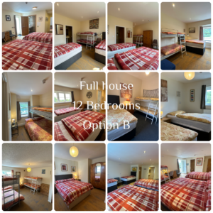 This package is for groups of up to 35 people, in 12 bedrooms, sole use of the house, no sharing with other groups required. 10 of the bedrooms are en-suite and 2 are with shared facilities. These are the rooms included in the Rental Package Option B (Full House Rental).